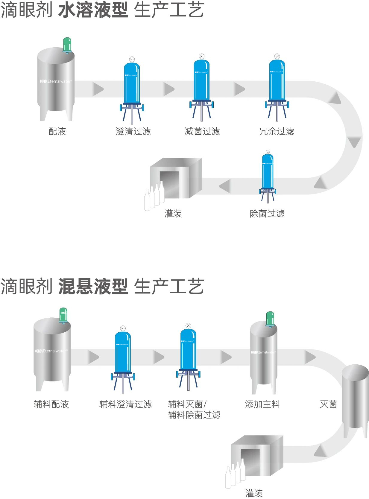 《中國(guó)藥典》2020年版通則0105眼用制劑中描述“滴眼劑系指由原料藥物與適宜輔料制成的供滴入眼內(nèi)的無菌液體制劑”。在滴眼劑的生產(chǎn)過程中需要將注射用水與藥物混合,然后制成滴眼劑進(jìn)行成品灌裝,分為澄明溶液、混懸液或乳狀液;也可將藥物以粉末、顆粒等形式包裝,另備溶劑,在臨用前配成澄明溶液或混懸液。